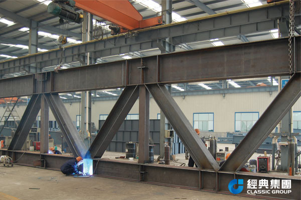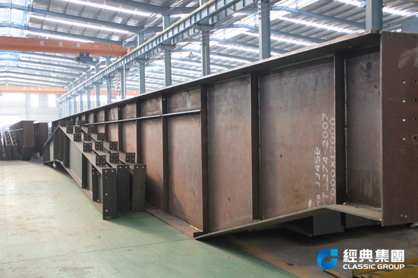 重钢厂房吊车梁一般都是大截面的,制作起来比轻钢厂房的吊车梁要求严格、制作困难,图片中的格构柱为重钢厂房的钢柱,制作工艺复杂。