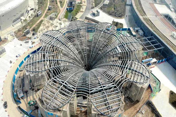 1978 枣庄市民中心是枣庄新城的地标建筑,采光顶幕墙造型由八枚巨型花瓣构成,造型十分美观。采光顶室内安装部分穿孔铝板,随着时间变幻,日光经过穿孔铝板后室内呈现不同光影效果。立面围护采用钢板肋拉杆点撑玻璃幕墙系统,玻璃板块为1400*6000mm的超大玻璃,组成一个直径为64m的圆形外围护幕墙。